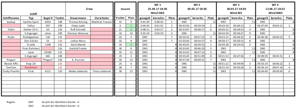 Aktueller Stand vom 15.06.2017. Die fehlenden Informationen zu den rot markierten Feldern bitte per E-Mail an unseren Regatta- und Segelwart Andreas Wulfes schicken!