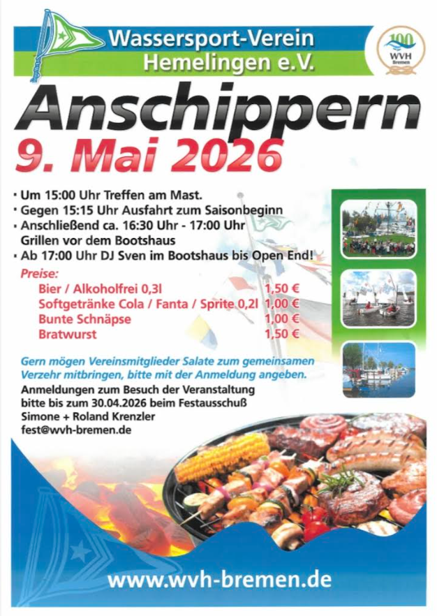 Der Festausschuss plant das diesjährige Anschippern, das am 9. Mai 26 stattfinden soll. Start ist um 15 Uhr am Mast – Ende offen! Um besser planen zu können, bittet der Festausschuss um eine Anmeldung per Mail an fest@wvh-bremen.de unter Angabe der Personenzahl, vegetarisch ja/nein sowie um Info, was (welcher Salat oder Leckerei) zum Buffet mitgebracht werden kann. DJ Sven wird im Bootshaus einheizen und Ihr könnt nach 80er-Jahre-Musik das Tanzbein schwingen und einen hoffentlich lustigen Abend verbringen.