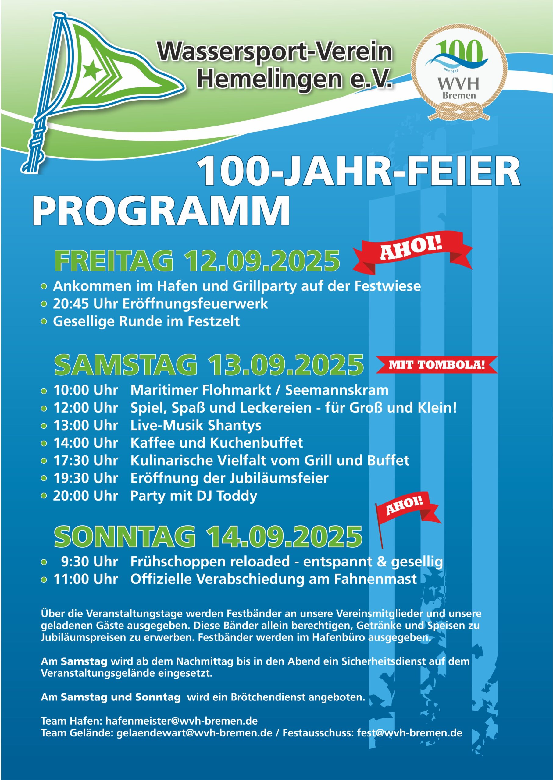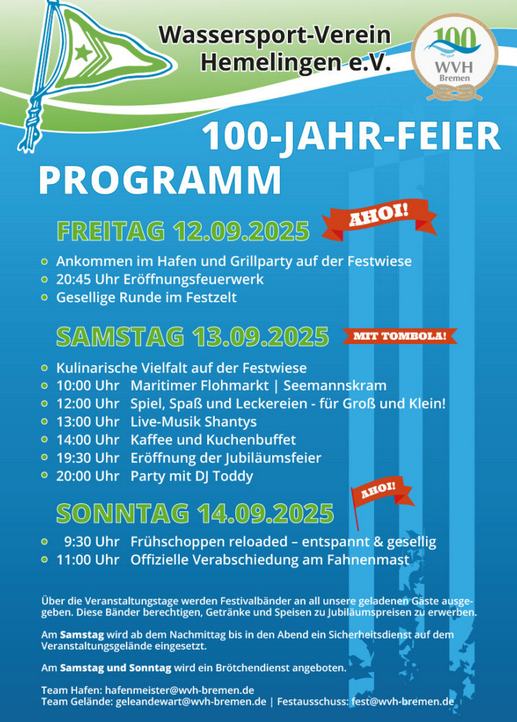 Unser 100-jähriges Jubiläum rückt immer näher. Das Programm ist auf unserer Website und im Schaukasten veröffentlicht. Wir hoffen auf ein wunderschönes Wochenende mit vielen Vereinsmitgliedern und Gästen und freuen uns auf das Fest. Denkt dran, dass viele Lichter unseren Hafen noch mehr erstrahlen lassen – schmückt Eure Boote und Wohnwagen/-mobile und lasst uns gemeinsam hoffen, dass das Wetter mitspielt.