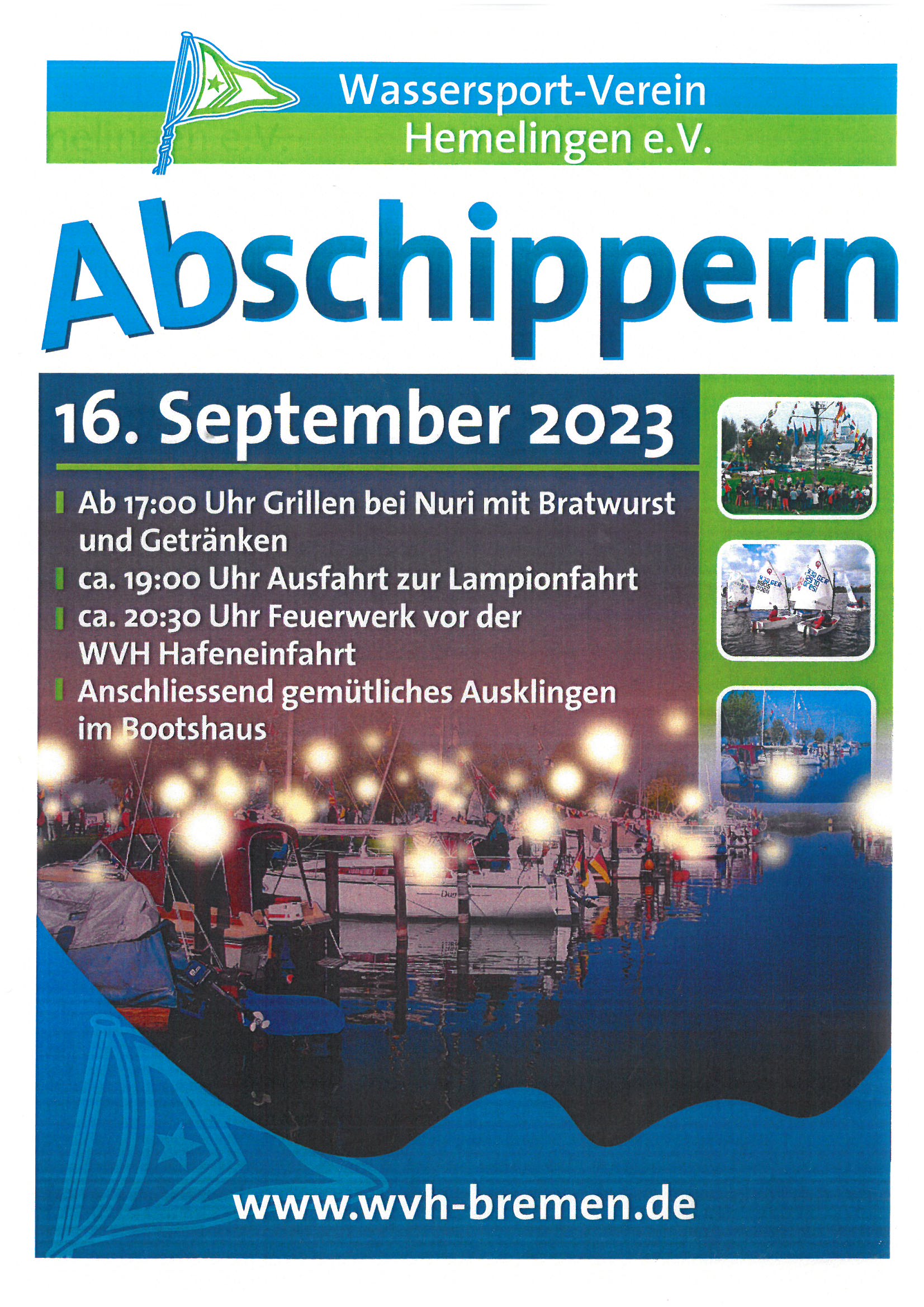 Am 16. September wird um 18 Uhr das Abschippern stattfinden. Wir haben bereits auf der Jahreshauptversammlung angekündigt, dass dieser Termin im kleinen Rahmen stattfinden wird, das heißt, nicht wie gewohnt, in Verbindung mit einem Hafenfest. Genaueres hierzu geben wir über einen Flyer im Schaukasten am Bootshaus sowie auf der Internetseite bekannt.