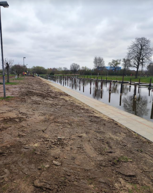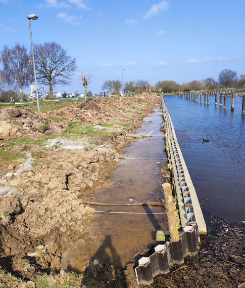 In Windeseile wurde die neue Spundwand verankert, Sand und Schlick abgetragen, der Boden begradigt und gepflastert. Sogar ein neuer Weg vom Hafen 2 zum Spielplatz wurde angelegt.
